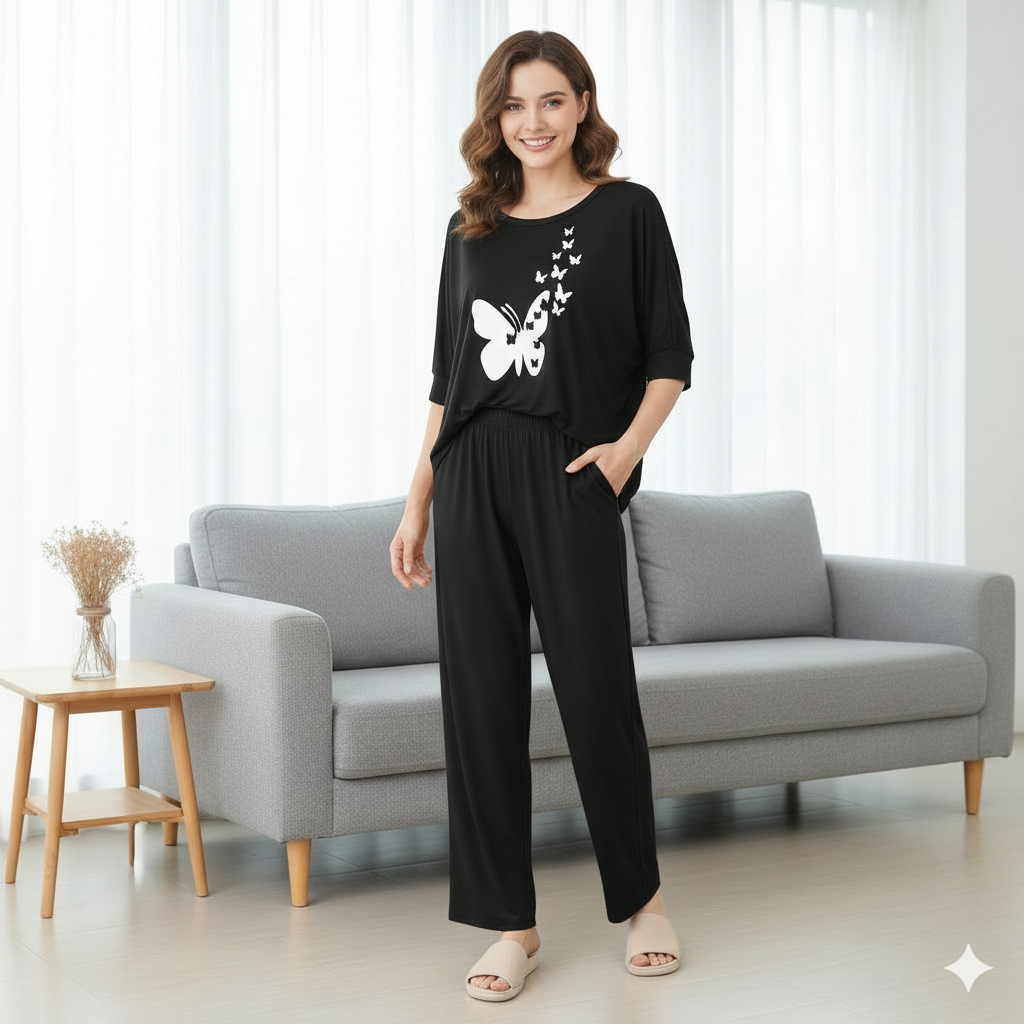 Women’s 2-Piece Butterfly Printed Night Suit – Soft & Breathable Lounge Wear PJ Set